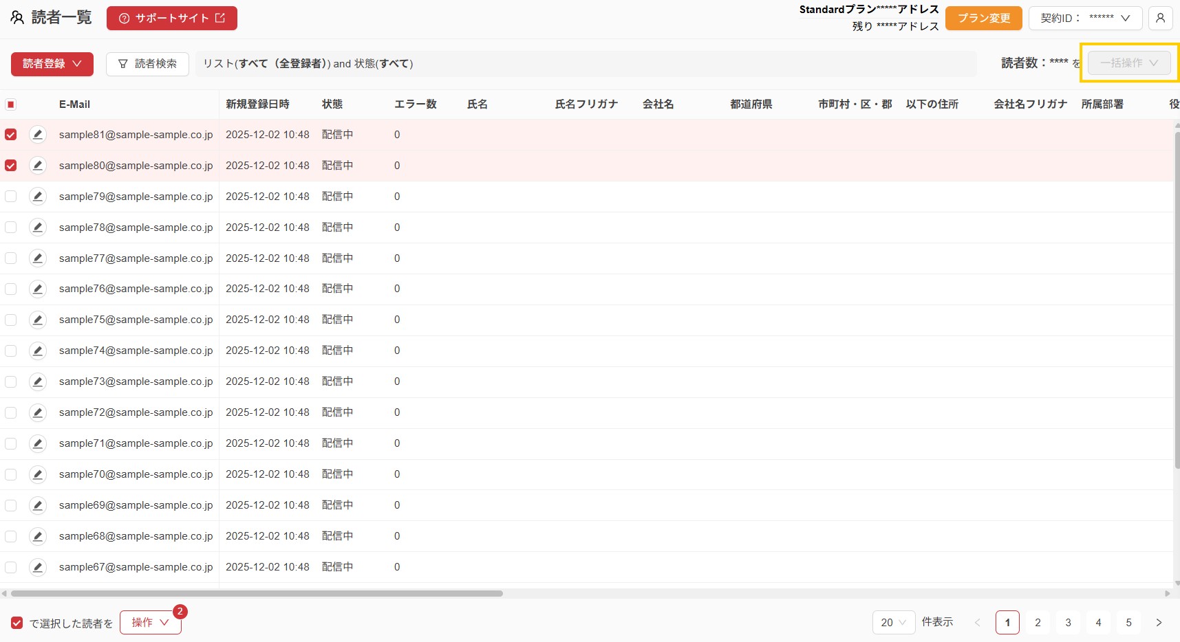 「一括操作」はボタン左側に表示される「読者数」全員を対象に実行される操作になります。