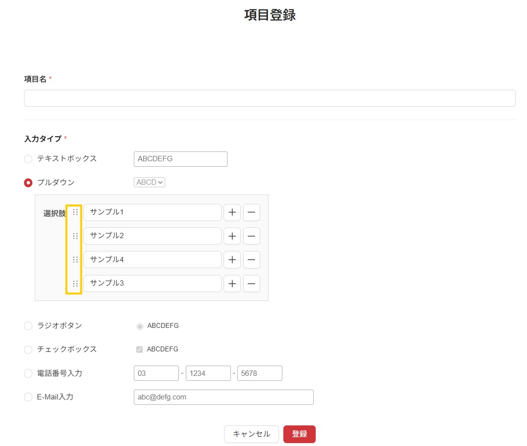 ①項目設定で作成した選択肢の順番を変更できるように改善