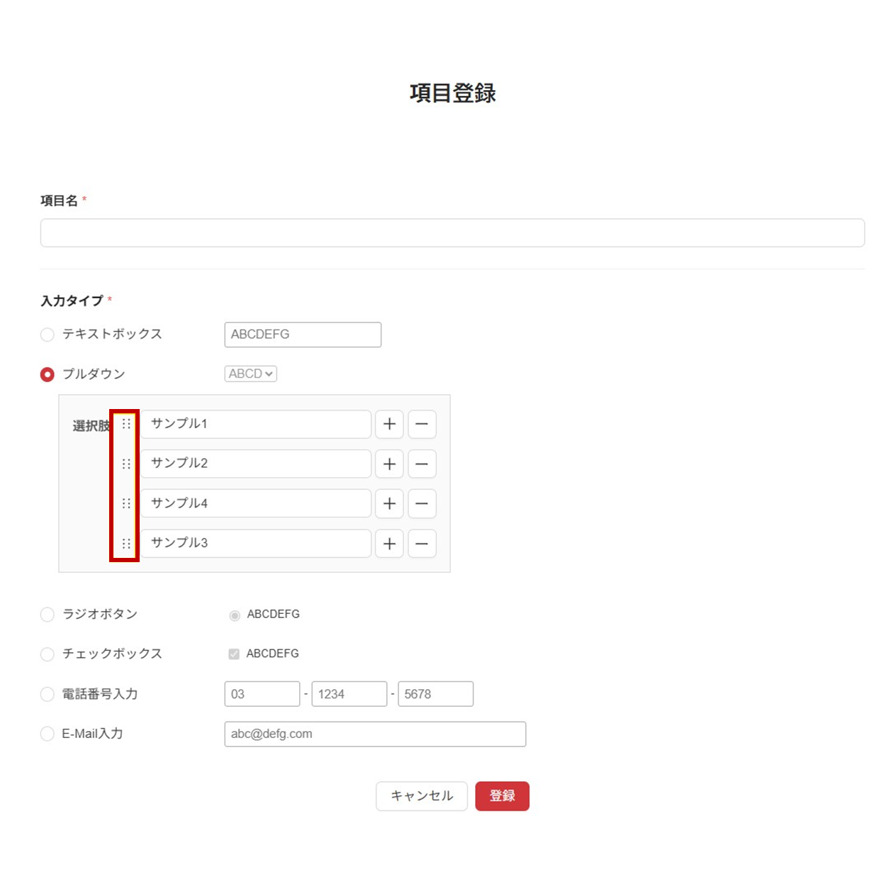 プルダウン・ラジオボタン・チェックボックスの選択肢は「+」で追加、「-」で削除できます。