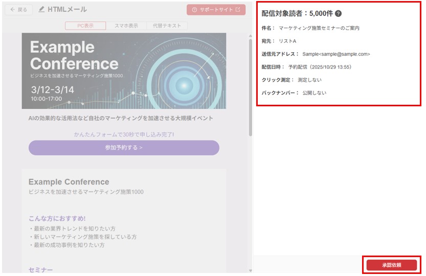 作成画面から「次へ」をクリック後、画面右側の設定内容を確認のうえ、問題なければ右下の「承認依頼」をクリックしてください。