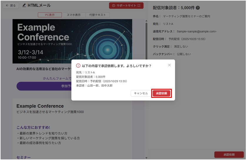 ユーザー管理機能で契約管理者から「承認が必要」と設定されているユーザーがメール配信する際は承認者の承認が必要です。