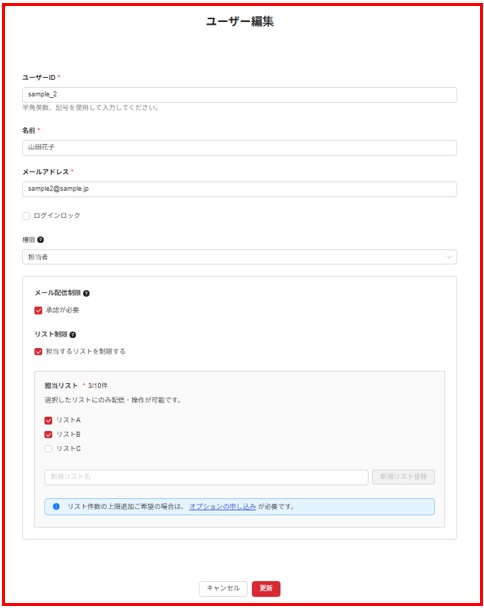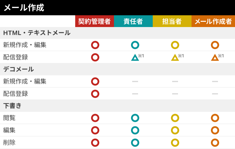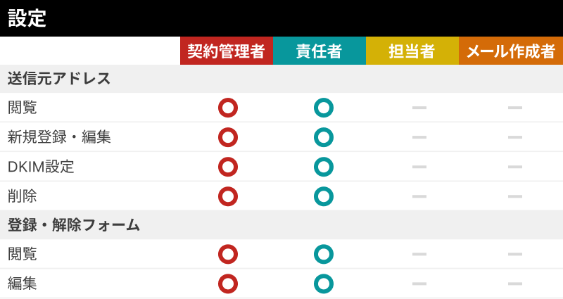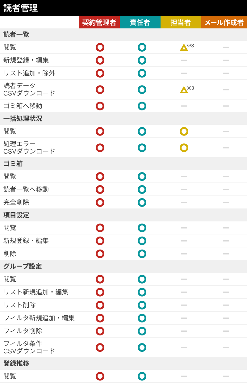 契約管理者は担当者とメール作成者に対し担当リストを設定することで、閲覧できる読者データや宛先に使用できるリストを制限することができます。