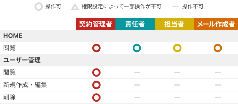 権限は契約管理者・責任者・担当者・メール作成者の4種類です。