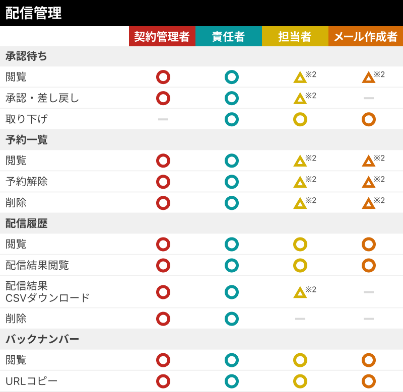 担当者・メール作成者は、担当リストに所属する読者データの閲覧や担当リストを宛先にした配信が可能になります。なお契約管理者と責任者は全てのリスト・フィルタ宛の配信が可能です。